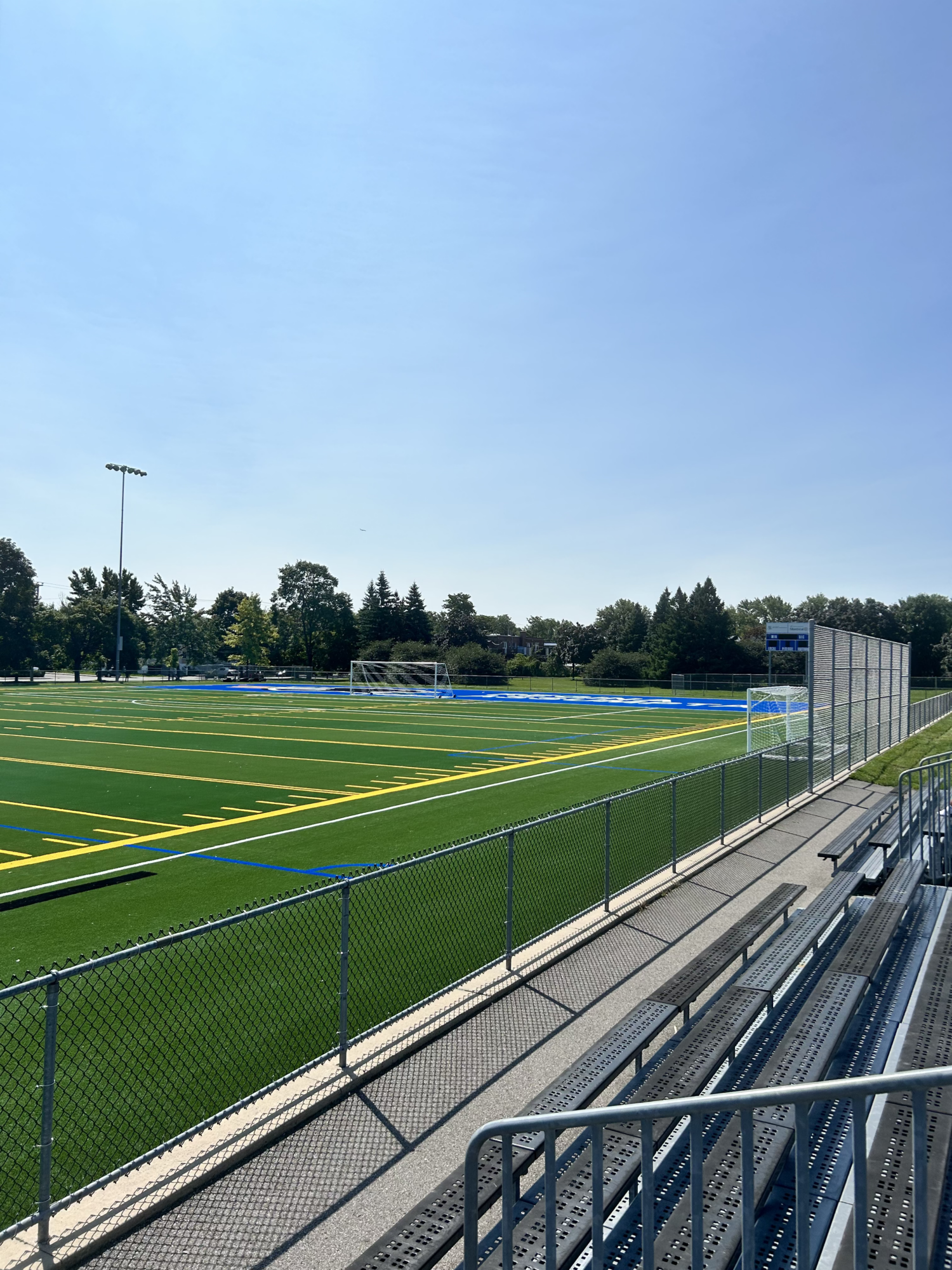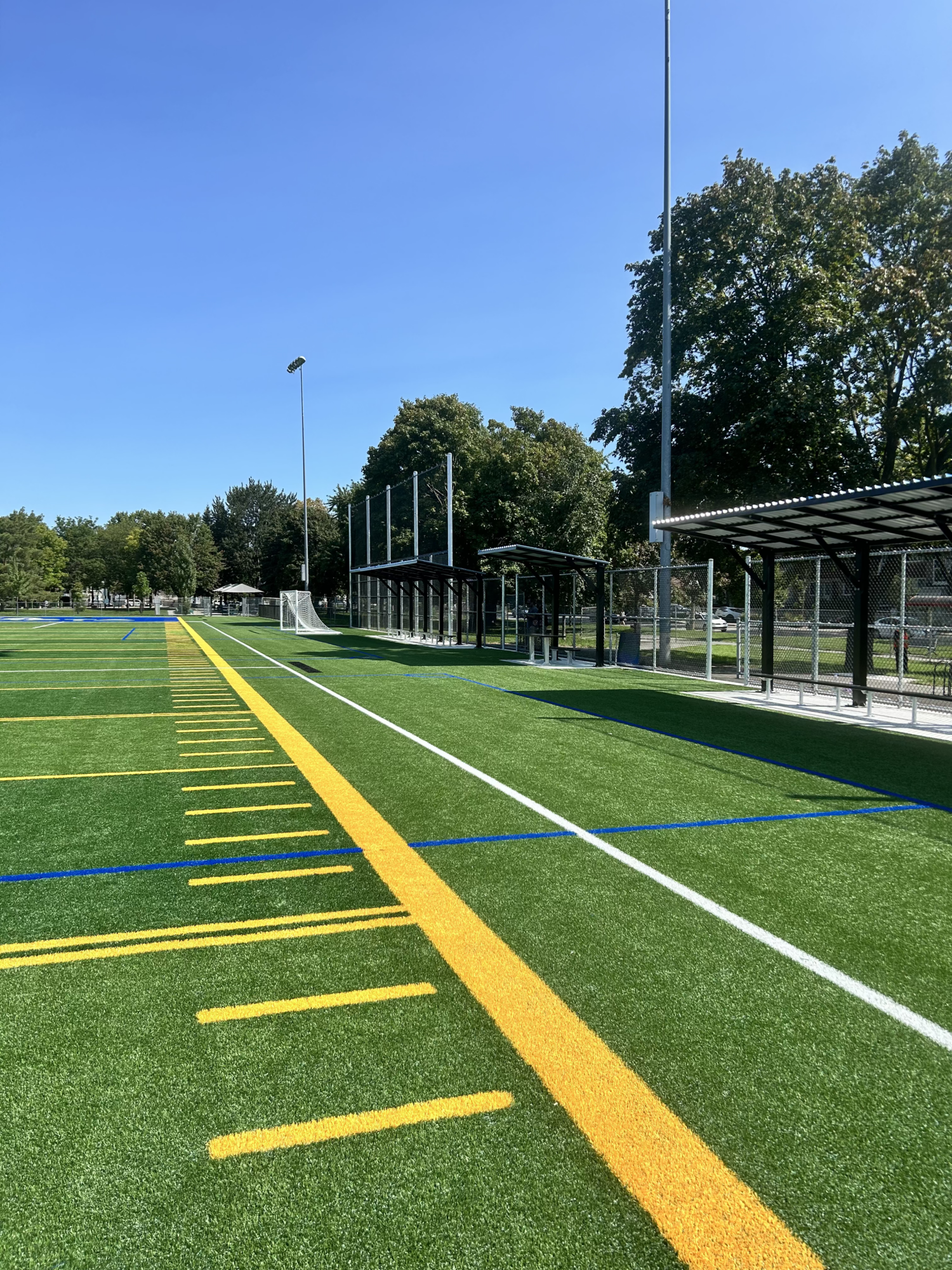 Remplacement du revêtement en gazon synthétique du terrain sportif selon les exigences soccer FIFA Quality 2015. Le projet incluait la construction de nouveaux arrêts ballon, des dalles et des abris pour les joueurs et les marqueurs. Remplacement d’une partie de la bordure d’ancrage du gazon synthétique et modification de la bordure existante pour ajouter à la conception une sous-base drainante (« shock pad »). Mise à jour de tous les éléments de clôture et d’ancrage des buts de soccer. Remplacement de tous les buts et équipements de terrain ainsi que la réfection des sentiers et accès au terrain.