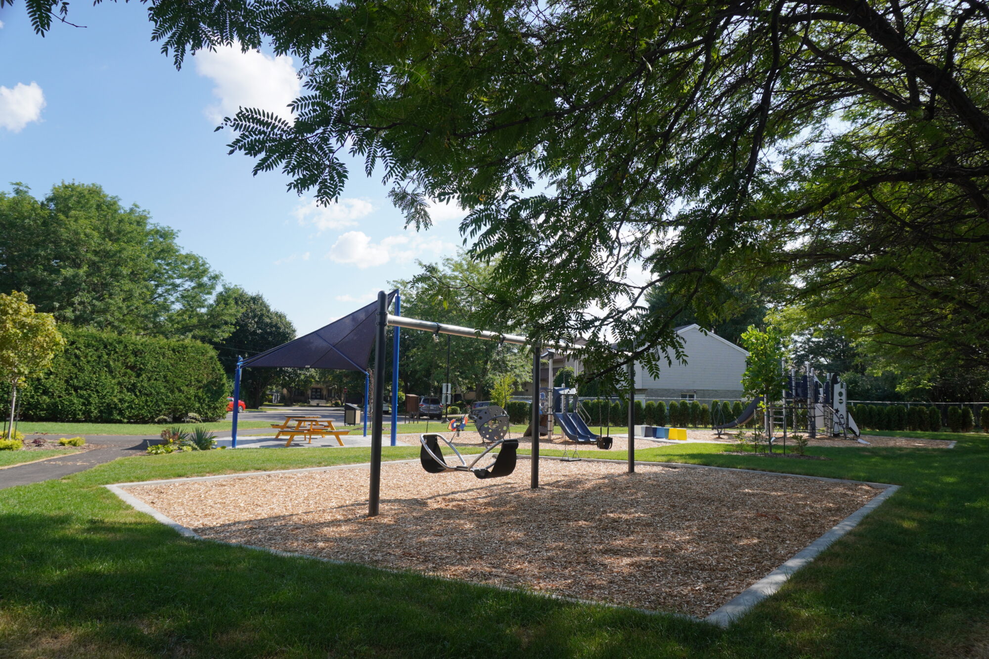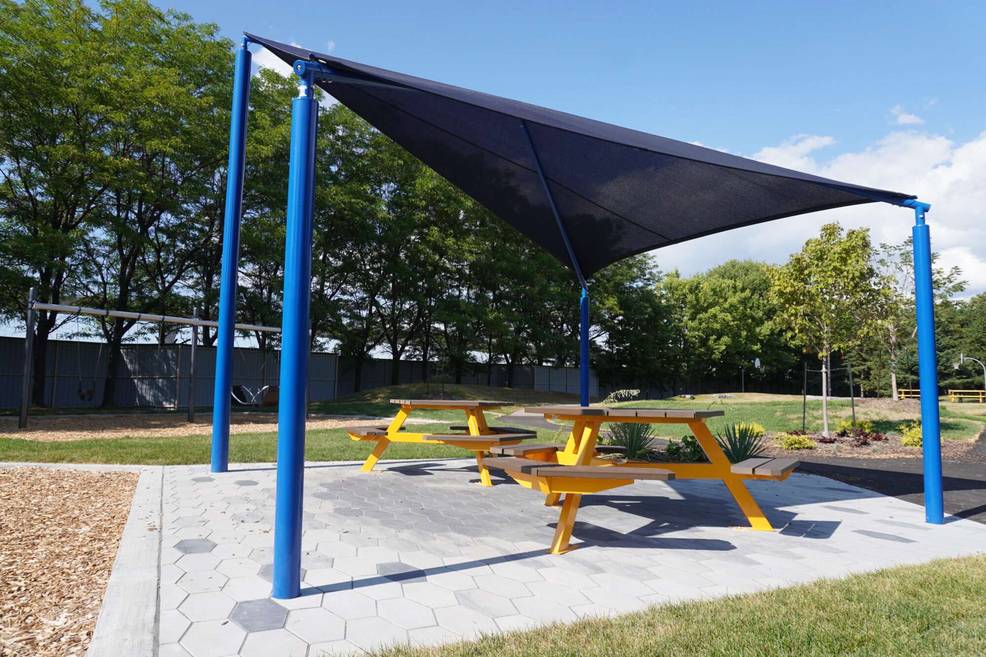 Réaménagement du parc Paiement avec de nouvelles aires de jeu pour les deux groupes d’âge sous la thématique de l’espace. Une aire de repos avec bancs colorés se trouve au centre des aires de jeu et permet un coup d’œil sur l’ensemble du parc. On retrouve également une placette avec des tables à pique-nique et un abri solaire.