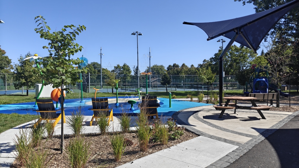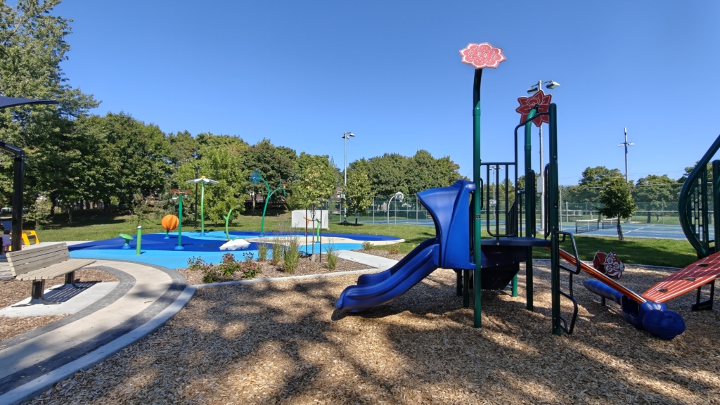 Réaménagement du parc Héritage inspiré par les couleurs emblématiques de la Maison Lantier située sur le même site. Vu à vol d’oiseau, le parc a la forme d’une fleur géante dont chaque pétale contient une aire de jeux différente. On retrouve des jeux d’eau, des équipements pour les deux groupes d’âge et des balançoires. Au centre de la fleur, on retrouve une placette avec abris solaires et tables à pique-nique.